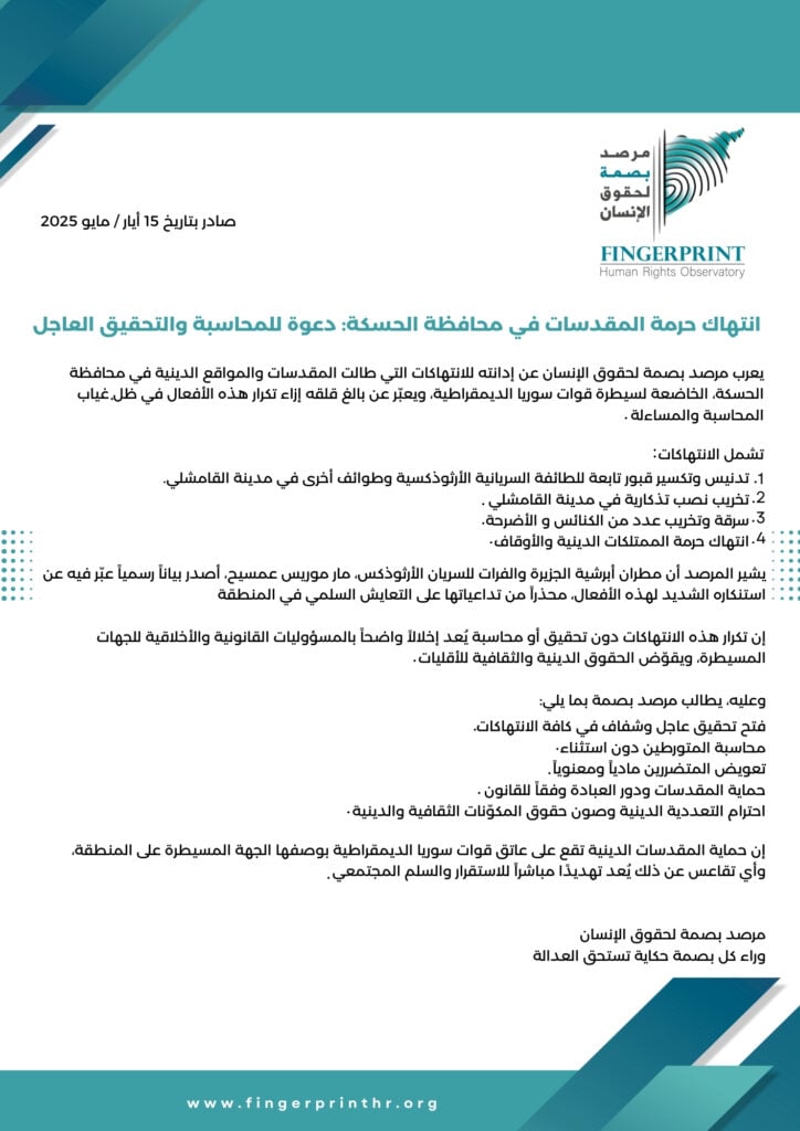 يعرب مرصد بصمة لحقوق الإنسان عن إدانته للانتهاكات التي طالت المقدسات والمواقع الدينية في محافظة الحسكة، الخاضعة لسيطرة قوات سوريا الديمقراطية، ويعبّر عن بالغ قلقه إزاء تكرار هذه الأفعال في ظل غياب المحاسبة والمساءلة.